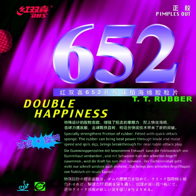 Накладка DHS 652 обладает короткими шипами с мягкой губкой, понравится любителям атакующего стиля игры. Характеризуется высокими показателями скорости и контроля.